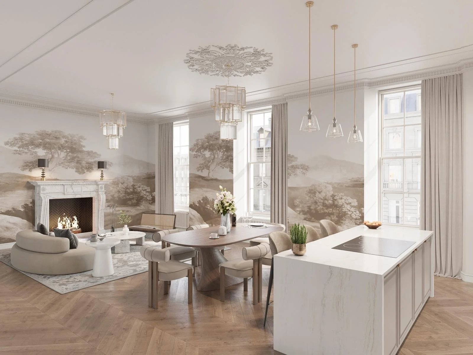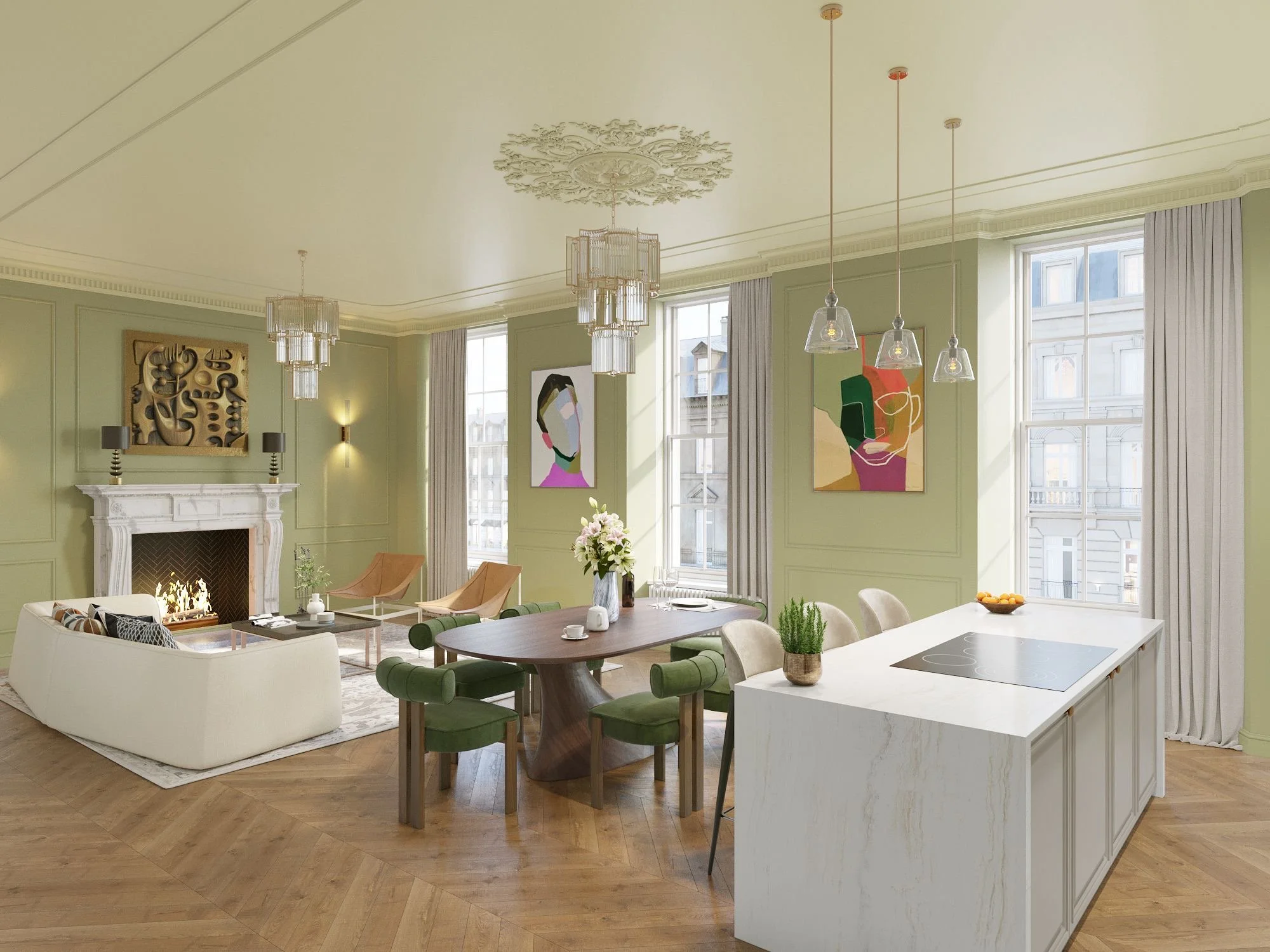 The residences at VI Golden Square offer a refined collection of two and three bedroom apartments. Each a harmonious blend of Georgian grandeur and contemporary style. Behind the timeless granite façade, you’ll find interiors of generous scale, where high ceilings with original ornate cornicing, restored sash and case windows, and carefully considered layouts evoke a sense of understated elegance.